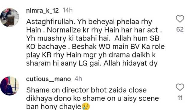 کئی صارفین نے شکایت کی کہ اب ڈراموں میں غیر ضروری بولڈ مناظر دکھائے جا رہے ہیں۔ ایک نے کہا: