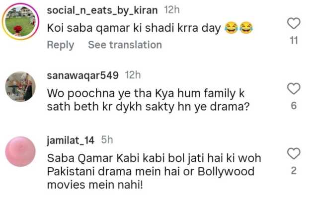 ’صبا قمر کو ہمیشہ بولڈ کرداروں میں ہی دیکھا ہے، لگتا ہے وہ بھول جاتی ہیں کہ یہ پاکستانی ڈرامہ ہے، کوئی بالی ووڈ فلم نہیں‘۔