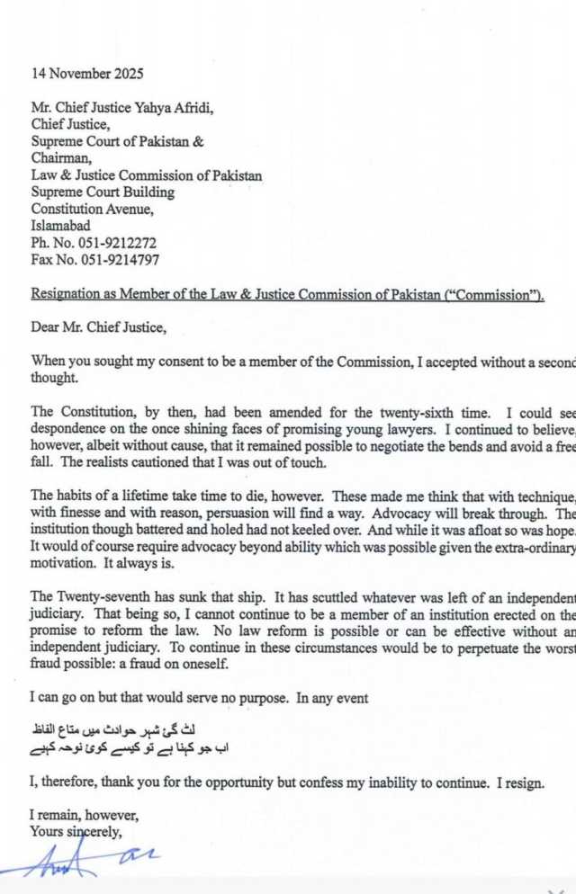 سپریم کورٹ کے جسٹس منصور علی شاہ نے 13 صفحات پر مشتمل استعفے میں کہا کہ 27 ویں آئینی ترمیم آئین پاکستان پر ایک سنگین حملہ ہے، 27 ویں آئینی ترمیم نے سپریم کورٹ آف پاکستان کو ٹکڑے ٹکرے کر دیا ہے۔