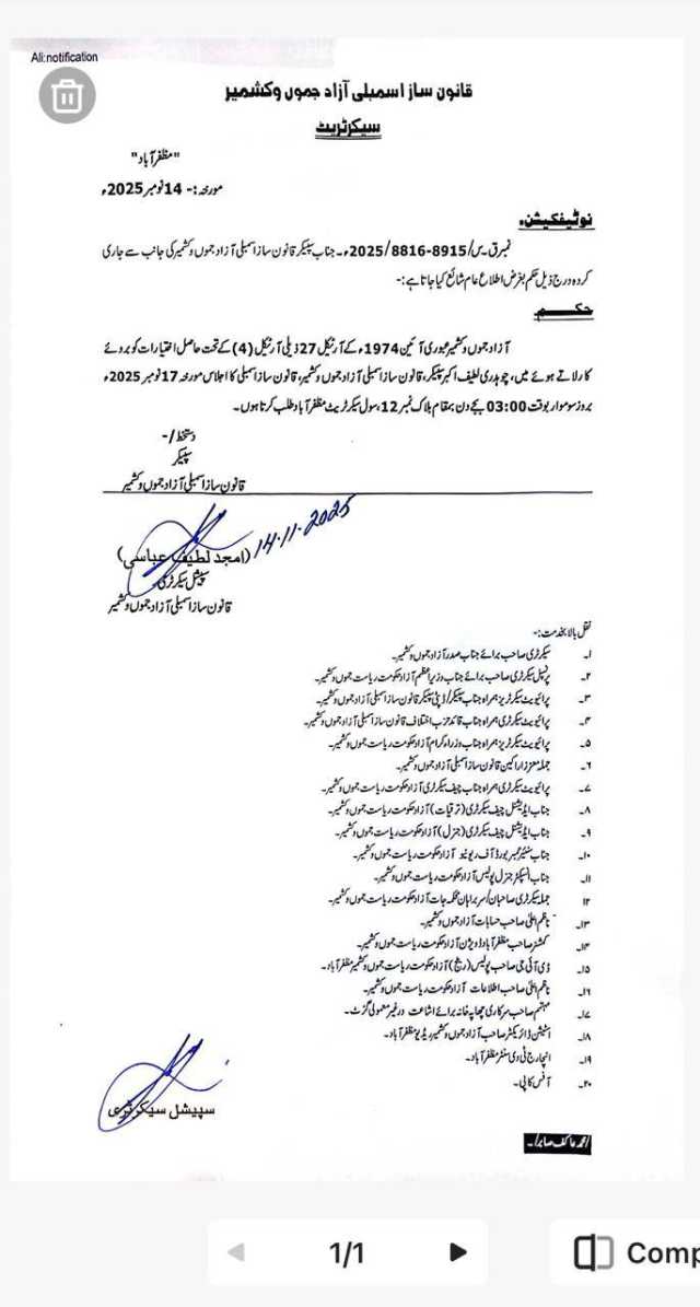 سٹی 42: سپیکر آزاد جموں کشمیر قانون ساز اسمبلی چودہری لطیف اکبر نے سترہ نومبر دن تین بجے قانون ساز اسمبلی کا اجلاس طلب کر لیا