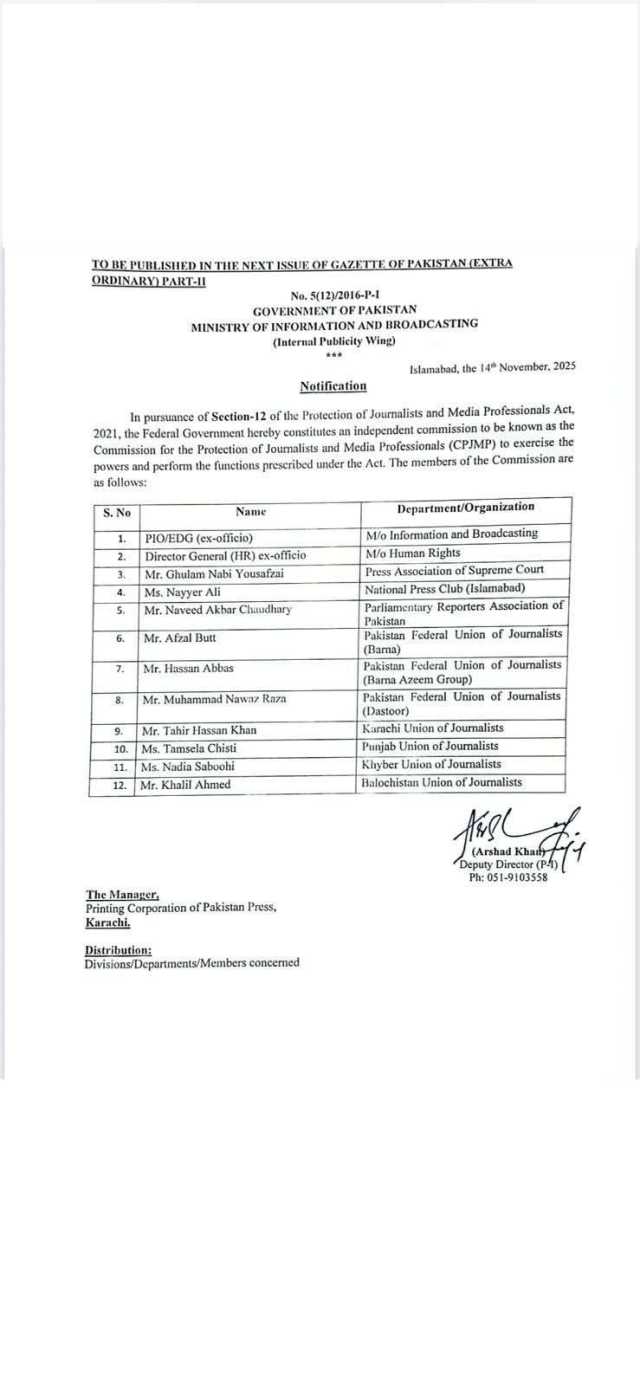 کمیشن کا قیام پروٹیکشن آف جرنلسٹس اینڈ میڈیا پروفیشنلز ایکٹ 2021 کے تحت عمل میں آیا،وزارت اطلاعات و نشریات نے کمیشن کے قیام کا باضابطہ نوٹیفکیشن جاری کر دیا۔