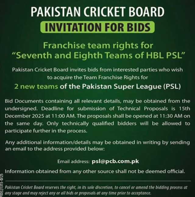 پاکستان کرکٹ بورڈ (پی سی بی) کی جانب سے جاری کردہ پریس ریلیز کے مطابق ٹیکنیّکل پروپوزلز جمع کرانے کی آخری تاریخ 15 دسمبر ہے، صرف تکنیکی طور پر اہل بڈرز ہی بڈنگ کے عمل کے اگلے مرحلے میں حصہ لینے کے مجاز ہوں گے۔
