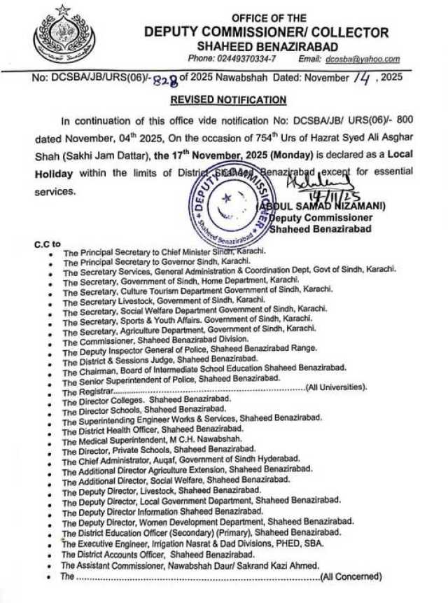 نواب شاہ کے ڈپٹی کمشنر شہید بینظیر آباد عبدالصمد نظامانی کی جانب سے ضلع میں 17 نومبر 2025ء بروز پیر کو مقامی تعطیل کا باضابطہ اعلان کر دیا گیا ہے۔