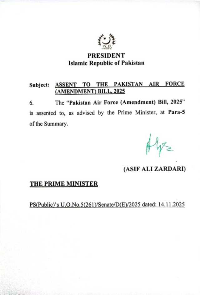 صدرِ مملکت آصف علی زرداری نے پاکستان آرمی (ترمیمی) بل 2025، پاکستان ایئر فورس (ترمیمی) بل 2025 اور پاکستان نیوی (ترمیمی) بل 2025 کی منظوری دے دی ہے۔