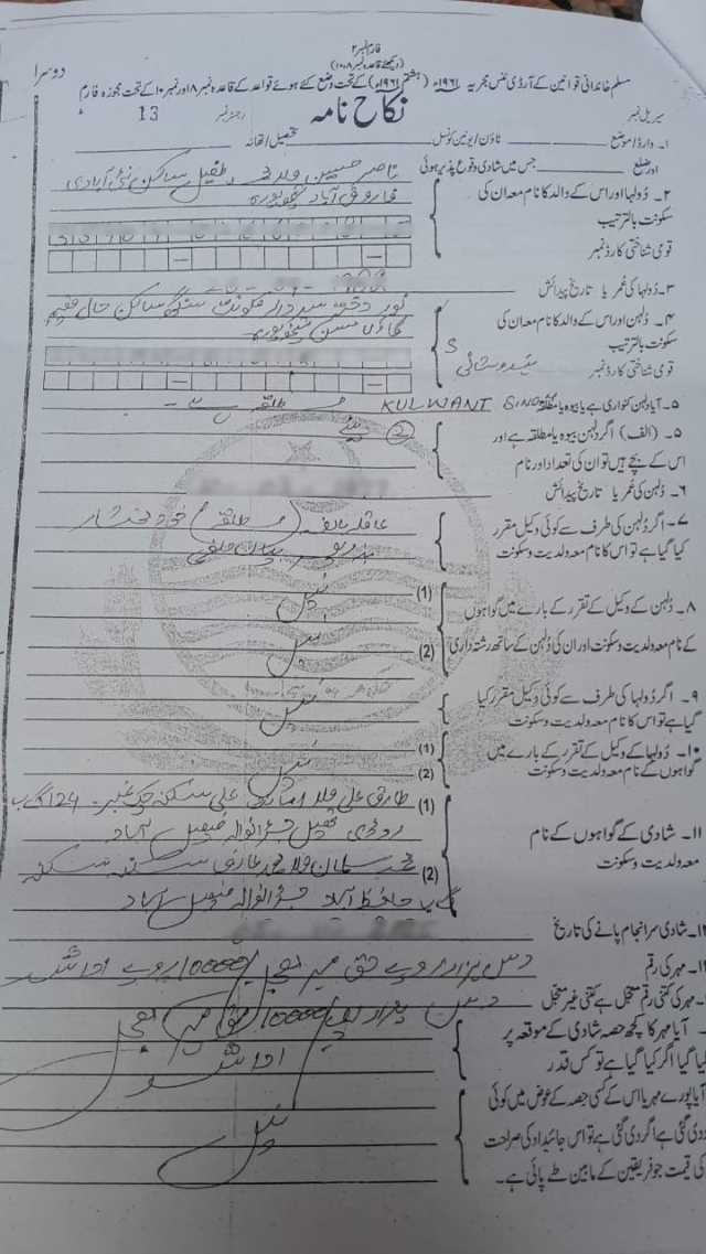 نکاح نامے میں 10 ہزار روپے حق مہر درج ہے جو ادا کیا جا چکا ہے۔ سربجیت کور 4 نومبر کو بھارتی یاتریوں کے ساتھ پاکستان آئی تھیں لیکن 13 نومبر کو بھارت واپس جانے والے یاتریوں میں شامل نہیں تھیں جبکہ اسی روز ان کا ویزہ بھی ختم ہوگیا تھا۔