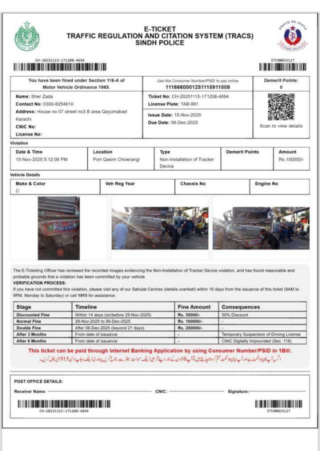 حادثے کا باعث بننے والی گاڑی کا ٹریکر نہ ہونے پر مالک کو ایک لاکھ روپے کا چالان