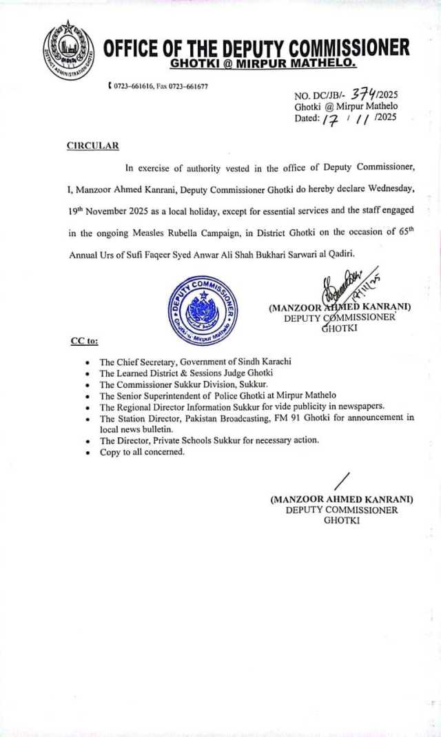گھوٹکی کے ڈپٹی کمشنر منظور کنرانی نے نوٹیفکیشن جاری کردیا، جس کے مطابق ضلع بھر میں 19 نومبر کو عام تعطیل ہوگی ۔