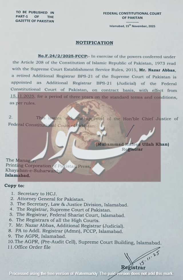 سپریم کورٹ کے گریڈ 21کے ریٹائرڈ افسر نذر عباس آئینی عدالت میں ایڈیشنل رجسٹرار جوڈیشل تعینات،نوٹیفکیشن سب نیوز پر