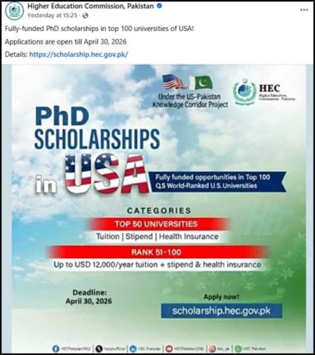 سوشل میڈیا پوسٹ کے مطابق اسکالرشپ پروگرام یو ایس-پاکستان نالج کوریڈور پروجیکٹ کے تحت شروع کیا گیا ہے۔