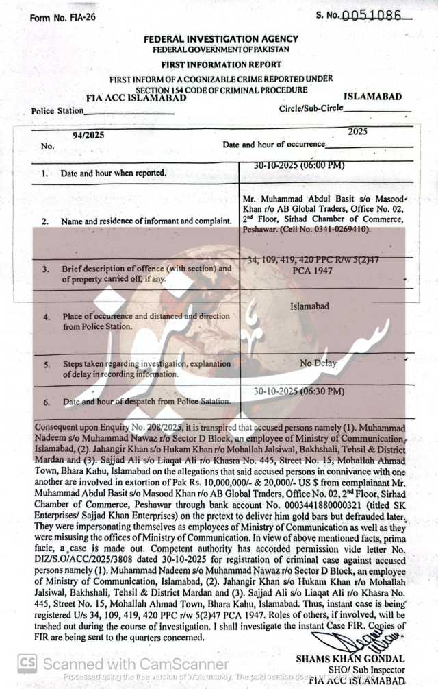 اسلام آباد (سب نیوز)ایف آئی اے نے وزات مواصلات کے ملازم کو دھوکہ دہی کے الزام میں گرفتار کر لیا،ایف آئی آر ذرج،تفتیش جاری،تفصیلات کے مطابق ملزم محمد ندیم ڈرائیور منسٹری آف کمیونیکیشن ،گورنمنٹ آفیشل اور سجاد علی ولد لیاقت علی ولد اسلام آباد کو مقدمہ ایف آئی آر نمبر 94/2025 مورخہ 30-10-2025 U/s 34, 109, R/419, P419 PC 1947 میں ان الزامات پر کہ انہوں نے ایک دوسرے کے ساتھ ملی بھگت سے اربوں روپے کی خورد برد کی۔ شکایت کنندہ محمد عبدالباسط ولد مسعود خان ساکنہ پشاور سے 10 ملین 20,000 امریکی ڈالر ذاتی بینک اکانٹ کے ذریعے این ایچ اے میں تعمیراتی ٹھیکے فراہم کرنے کے بہانے منگوائے اور خود کو وزارتِ مواصلات کا ملازم ظاہر کیا،ملزمان نے اسلام آباد میں وزارتِ مواصلات کے دفاتر کا غلط استعمال کیا۔