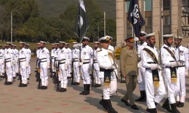 اس سے قبل نیول ہیڈکوارٹرز پہنچنے پر جنرل ساحر شمشاد مرزا کو ایک چاک و چوبند دستے نے گارڈ آف آنر پیش کیا۔