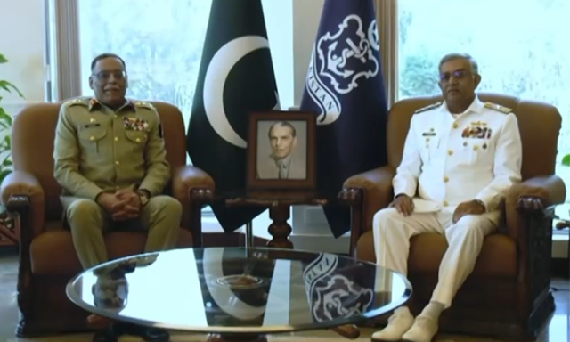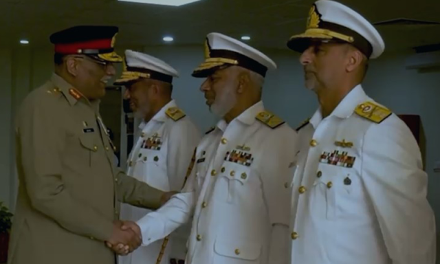 چیئرمین جوائنٹ چیفس آف اسٹاف کمیٹی جنرل ساحر شمشاد مرزا نے اسلام آباد میں نیول ہیڈکوارٹرز کا الوداعی دورہ کیا جہاں انہوں نے چیف آف دی نیول اسٹاف ایڈمرل نوید اشرف سے ملاقات کی۔