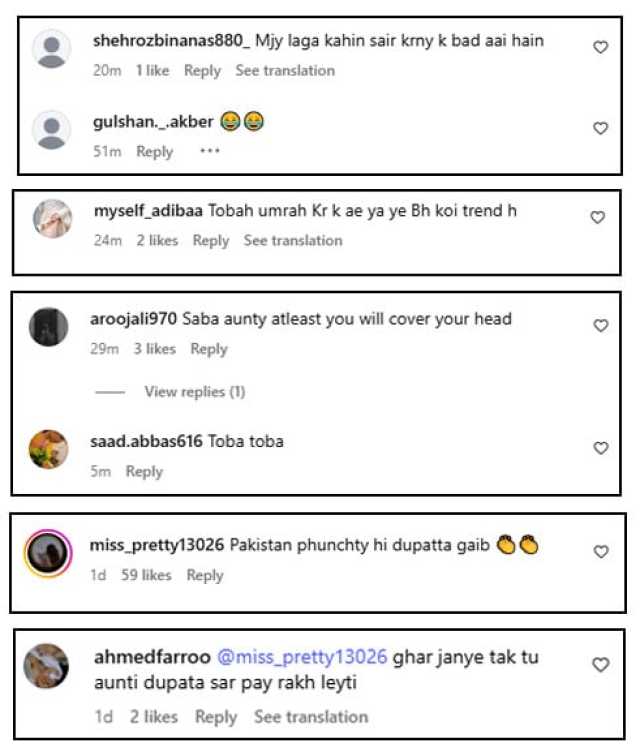 عروج علی نے لکھا کہ ’صبا آنٹی کم از کم آپ اپنا سر ہی ڈھانپ لیتیں‘۔ یہاں اُن کا اشارہ دوپٹہ اڑنے یا حجاب کی طرف ہے۔