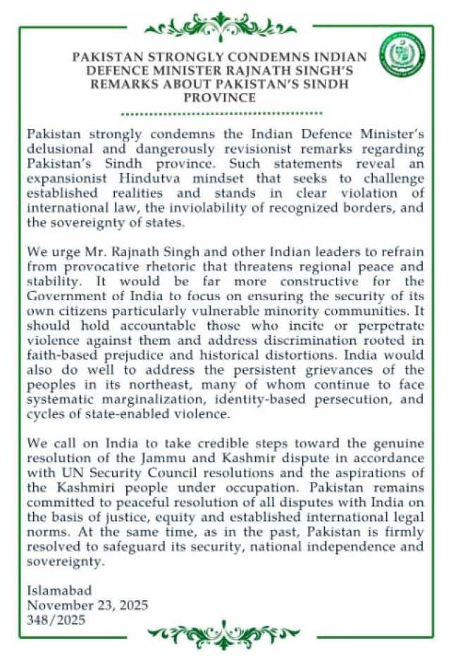 دفترِ خارجہ کی جانب سے جاری بیان میں کہا گیا ہے کہ بھارتی وزیر دفاع راج ناتھ سنگھ کے صوبہ سندھ کے دوبارہ بھارت کا حصہ بننے سے متعلق اشتعال انگیز بیان امن کیلئے خطرہ ہے۔