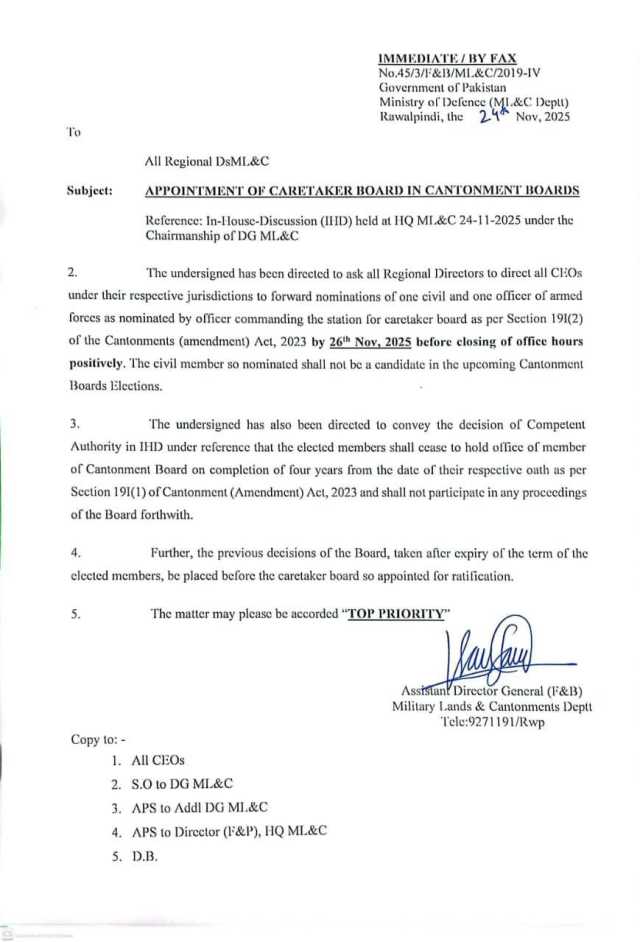 علاوہ ازیں کنٹونمنٹس ایگزیکٹیو آفیسرز سے کئیر ٹیکر بورڈ کے لیے نام طلب کرلیے گئے ہیں۔ کئیر ٹیکر بورڈ کے لیے نام 26 نومبر کو دفتری اوقات ختم ہونے سے پہلے ریجنل ڈائریکٹر ایم ایل سی کو فراہم کرنے ہونگے ۔