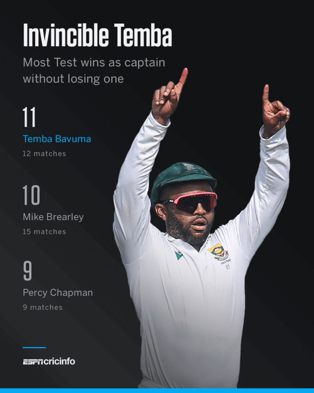اس تاریخی کامیابی نے جنوبی افریقا کے کپتان ٹیمبا باووما کو بھی ایک منفرد مقام دلایا اور جنوبی افریقی کپتان باووما ٹیسٹ کرکٹ کی تاریخ میں بغیر کوئی میچ ہارے سب سے زیادہ فتوحات حاصل کرنے والے کپتان بن گئے ہیں۔