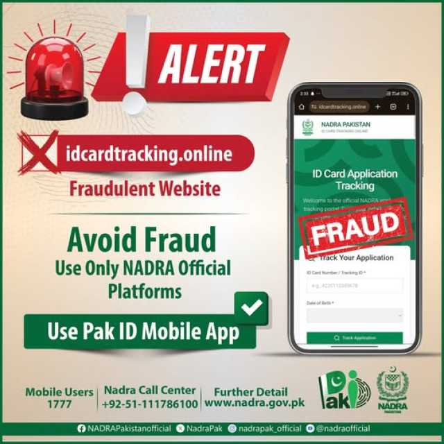 نادرا نے سوشل میڈیا پر جاری پیغام میں کہا ہے کہ idcardtracking.online جعلی ویب سائٹ ہے، شہریوں بالخصوص بیرون ملک مقیم پاکستانیوں کو مشورہ دیا جاتا ہے کہ وہ شناخت سے متعلق خدمات کے لیے ایجنٹوں یا تھرڈ پارٹی سروس فراہم کنندگان سے لین دین نہ کریں۔