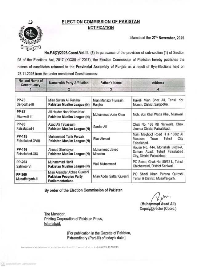 ضمنی انتخابات میں کامیاب امیدواروں کا نوٹیفیکیشن جاری، طلال چوہدری کے بھائی کا نوٹیفکیشن روک دیا گیا