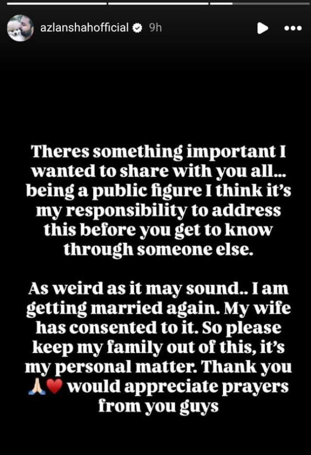 اذلان شاہ نے ایک روز قبل انسٹاگرام پر شیئر کی گئی پوسٹ میں دوبارہ شادی کرنے کا ذکر کیا تھا جس پر انہیں شدید تنقید کا سامنا کرنا پڑا۔