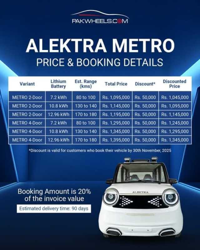 گاڑی کی بکنگ اور ٹیسٹ ڈرائیو ALEKTRA کے لبرٹی پارکنگ پلازہ (فرنٹ سائیڈ) پر دستیاب ہے۔ ڈیلیوری 90 دن کے اندر متوقع ہے۔