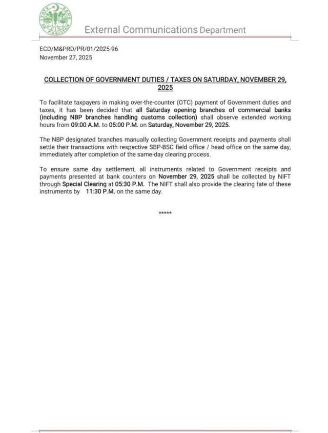 سٹی 42 : سٹیٹ بینک آف پاکستان نے اعلان کیا ہے کہ ہفتہ 29 نومبر 2025 کو سرکاری ڈیوٹیز اور ٹیکسز کی وصولی کو یقینی بنانے کے لیے بینکوں کے اوقات میں خصوصی توسیع کی جائے گی۔