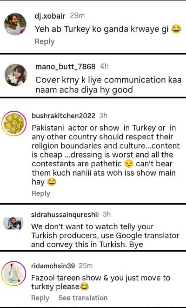 عائشہ عمر نے لکھا کہ اس پروگرام کو کسی پاکستانی پروڈکشن ہاؤس یا پروڈیوسر نے تخلیق نہیں کیا البتہ یہ ترکش پروڈکشن ہے اور وہاں کے ایک بڑے پروڈکشن ہاؤس نے پروگرام بنایا ہے، جس نے یہ شو نہیں دیکھا اُس نے اپنے خیالات از خود پیدا کرلیے ہیں۔