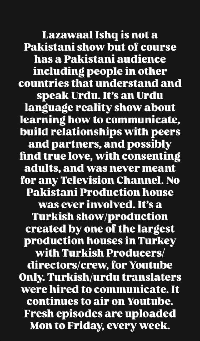 عائشہ عمر نے لکھا کہ ’لازوال عشق پاکستانی پروڈکشن یا شو نہیں اور نہ ہی اس پروگرام پر کسی کورٹ کی طرف سے پابندی لگائی گئی ہے، یہ پاکستانی اور اردو بولنے یا سمجھنے والے ناظرین کیلیے بنایا جانے والا ایک شو ہے جسے کسی چینل نہیں بلکہ یوٹیوب پر نشر کیا جاتا ہے‘۔