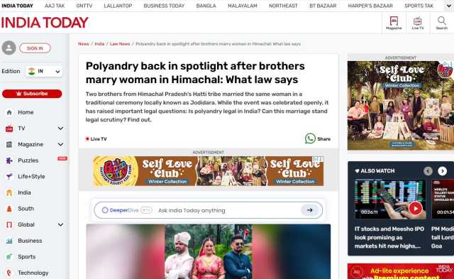 بھارت کے کچھ علاقوں میں آج بھی رائج قدیم رسم پولیانڈری (Polyandry) انسانی حقوق اور خواتین کے وقار کے لیے شدید خطرہ بن گئی ہے۔ اس رسم میں ایک خاتون کو بیک وقت متعدد مردوں کی شریکِ حیات ہونا پڑتا ہے، جسے بھارت سرکار ثقافتی ورثہ اور 5 ہزار سالہ تہذیب کا نام دیتی ہے۔