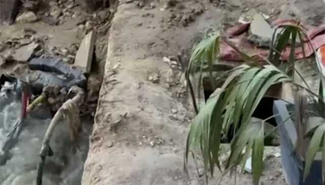 نجی اسٹور کے باہر کھودا جانے والا مقام تین دن بعد بھی ویسا ہی ہے، قریب چھوٹے بلاکس رکھے گئے ہیں۔