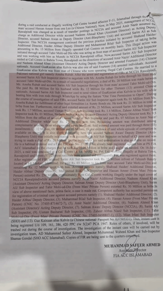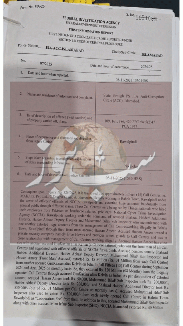 اسلام آباد (آئی پی ایس) این سی سی آئی اے کیس (ایف آئی آر 97/25) میں اہم پیش رفت سامنے آئی ہے۔ ایف آئی اے اینٹی کرپشن سرکل اسلام آباد کی کارروائی کے دوران ڈی ڈی این سی سی آئی اے سلمان اعوان اور مرکزی ملزم ایس آئی صارم علی کی قبل از گرفتاری ضمانت اسپیشل جج سینٹرل-II اسلام آباد کی عدالت نے مسترد کر دی، جس کے بعد دونوں ملزمان کو عدالت کے باہر سے گرفتار کر لیا گیا۔