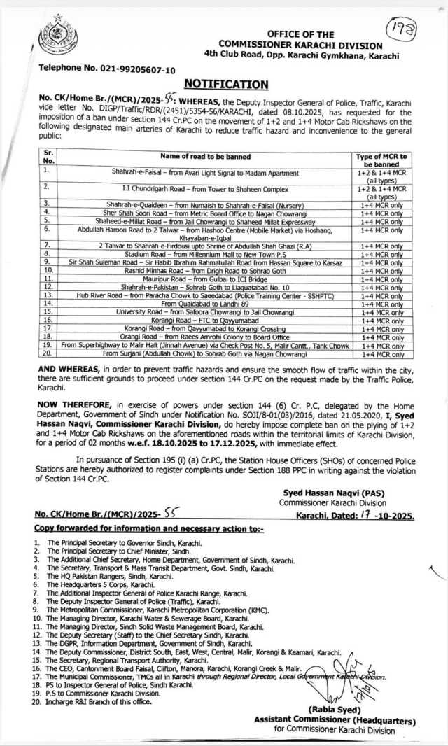 شہر کی 20 سڑکوں پر رکشہ پابندی 18 اکتوبر سے 17 دسمبر 2025 تک مؤثر قرار دی گئی ہے جبکہ ٹریفک کی روانی بہتر بنانے کیلئے کمشنر کراچی نے سیکشن 144 کے تحت پابندی نافذ کر دی۔