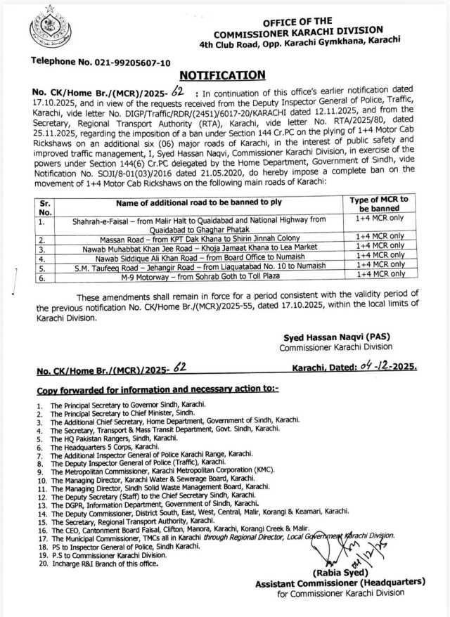 کمشنر کراچی نے مزید چھ بڑی شاہراہوں پر 1+4 رکشوں کی آمد و رفت پر مکمل پابندی عائد کی جبکہ ٹریفک پولیس کی نئی سفارشات پر رکشہ پابندی کے دائرہ کار میں باضابطہ توسیع کر دی گئی۔ نئی چھ شاہراہوں پر رکشہ پابندی پہلے سے جاری نوٹیفیکیشن کے مساوی مدت کیلئے نافذ رہے گی۔ اضافی سڑکوں پر پابندی عوامی تحفظ، ٹریفک مینجمنٹ اور شہری سہولت کو مدنظر رکھتے ہوئے لگائی گئی۔