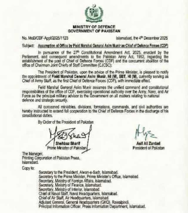 تفصیلات کے مطابق سوشل میڈیا پلیٹ فارمز پر فیلڈ مارشل سید عاصم منیر کے پاکستان کے پہلے چیف آف ڈیفنس فورسز مقرر ہونے کا صدرمملکت اور وزیراعظم کے دستخطوں سے جاری نوٹیفکیشن تیزی سے وائرل ہو رہا ہے تاہم اس حوالے سے سب نیوز کی فیکٹ چیک میں حقیقت سامنے آ گئی کہ یہ نوٹیفکیشن جعلی ہے اور اس کا حقائق سے کوئی تعلق نہیں ۔