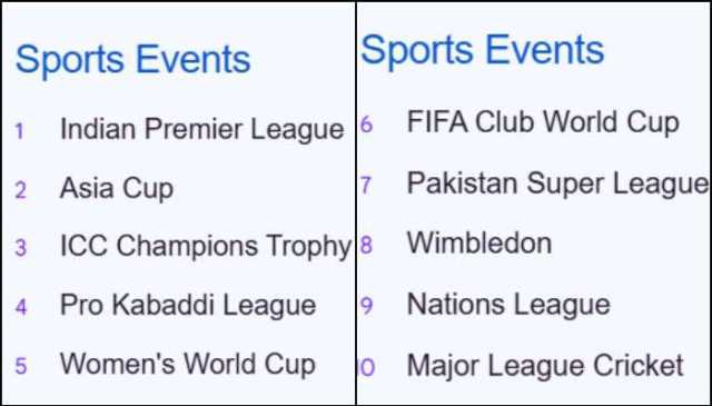 جاری کردہ فہرست میں بھارت میں سب سے زیادہ سرچ کیے جانے والے اسپورٹس ایونٹس میں انڈین پریمیئر لیگ (آئی پی ایل) پہلے نمبر پر، ایشیا کپ دوسرے، آئی سی سی چیمپئنز ٹرافی تیسرے، پرو کبڈی لیگ چوتھے اور ویمنز ورلڈکپ پانچویں نمبر پر رہے۔