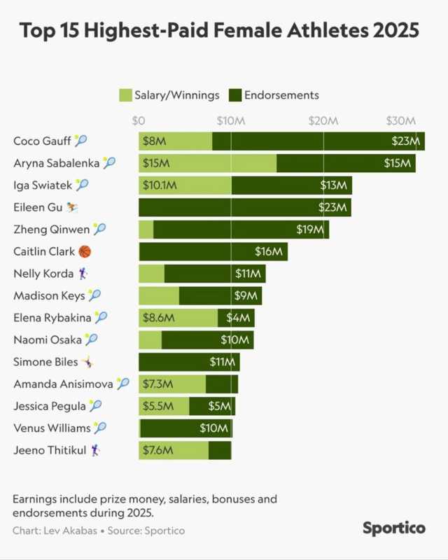 اب تک صرف 4 ویمن ایتھلیٹس سال میں 30 ملین ڈالرز کما چکی ہیں، جس میں کوکو گوف، ارینا سبالنکا، نومی اوساکا اور سرینا ولیمز شامل ہیں۔