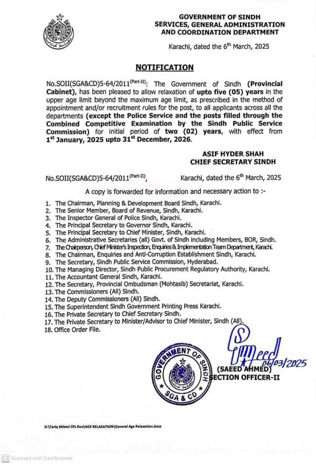 عمر کی حد میں مزید پانچ اور دو سالوں کی رعایت دے دی ،سندھ کابینہ کی منظوری کے بعد نوٹی فکیشن جاری کردیا۔نوٹی فکیشن محکمہ سروسز جنرل ایڈمنسٹریشن و کو آرڈی نیشن نے جاری کیا