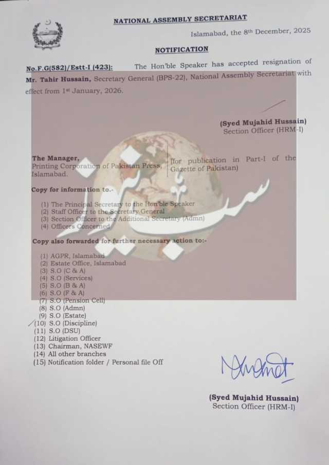 جاری کردہ تفصیلات کے مطابق طاہر حسین کا استعفیٰ یکم جنوری 2026 سے مؤثر ہوگا۔ ذرائع کے مطابق انہوں نے ذاتی وجوہات کی بنیاد پر اپنے عہدے سے استعفیٰ پیش کیا تھا۔