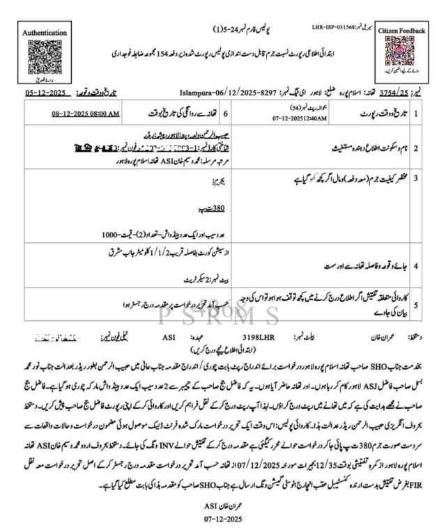 تھانہ اسلام پورہ میں درج ایف آئی آر کے مطابق یہ واقعہ 5 دسمبر کو پیش آیا، جب ایڈیشنل سیشنز جج نور محمد بسمل کے چیمبر سے 2 سیب اور ہینڈ واش چوری پایا گیا۔ چوری شدہ اشیا کی مجموعی مالیت 1000 روپے بتائی گئی ہے۔