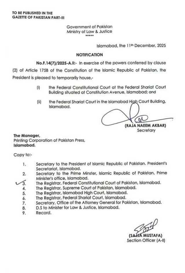 وفاقی آئینی عدالت فیڈرل شریعت عدالت کی عمارت میں منتقل ؛ نوٹیفیکشن جاری