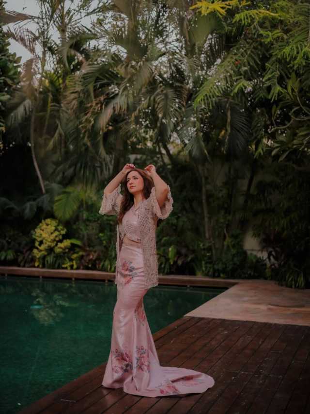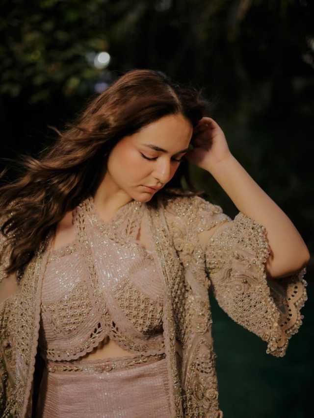 اس لباس میں روز گولڈ لمبی اسکرٹ، اینٹیک گولڈ کراپ ٹاپ اور کڑھائی و ٹِلّہ ورک سے مزین چمکدار جیکٹ شامل تھی۔